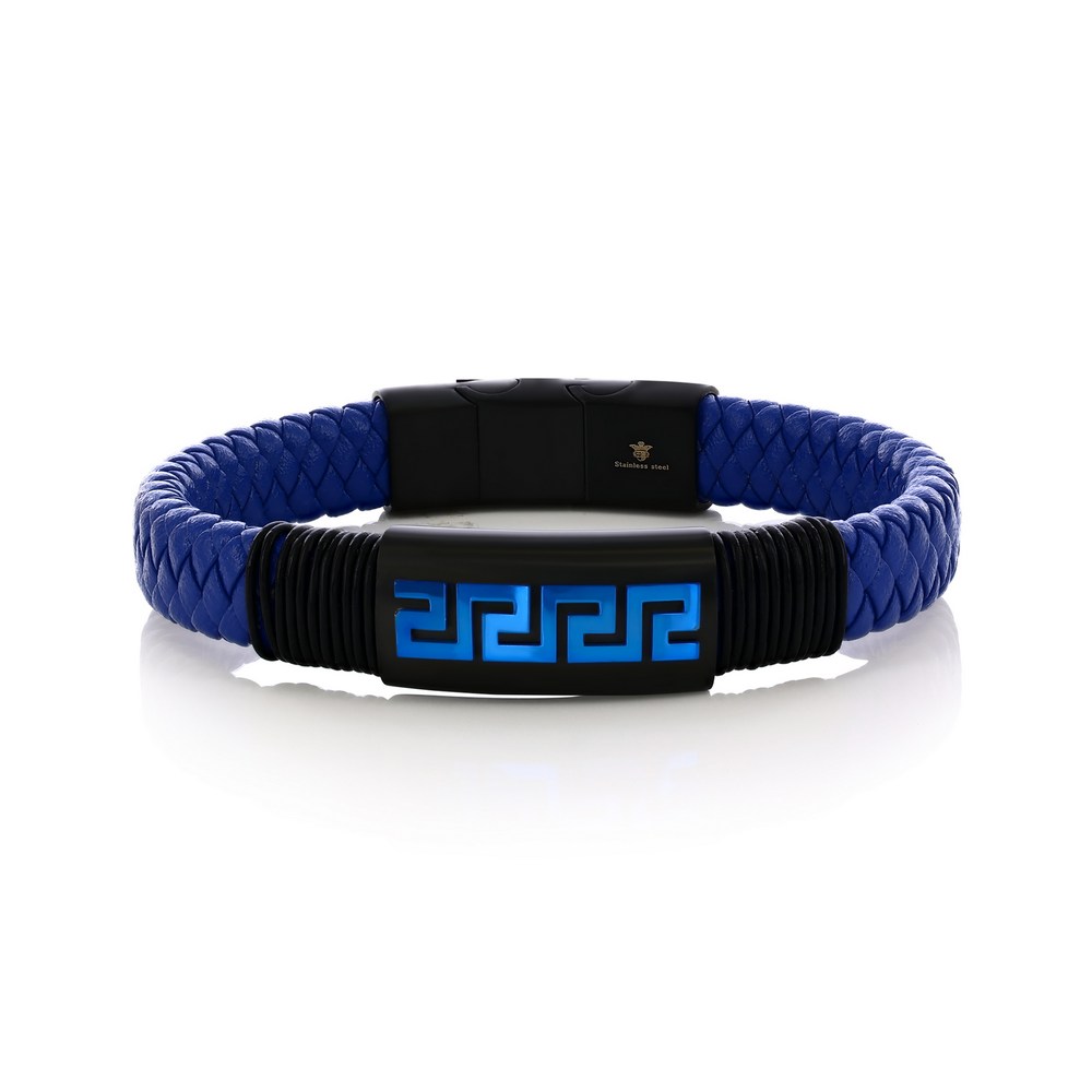 Stainless Steel, Braided Leather Greek Key Bracelet – Blue