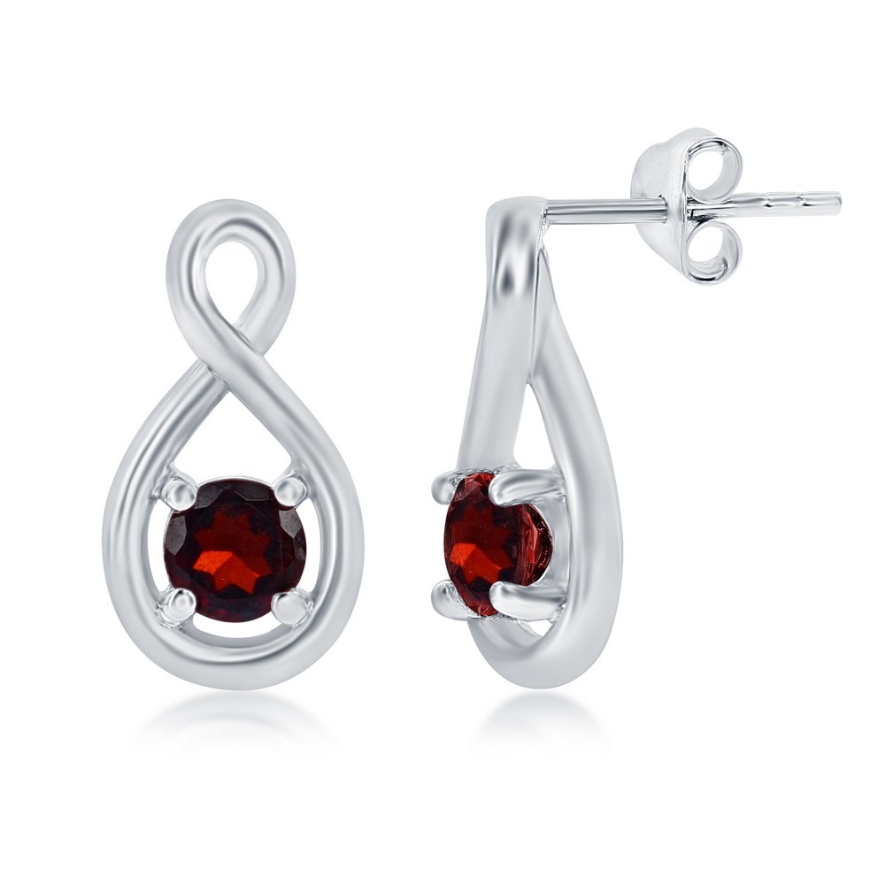 Sterling Silver, 4mm Round Gem Infinity Design Earrings – Garnet