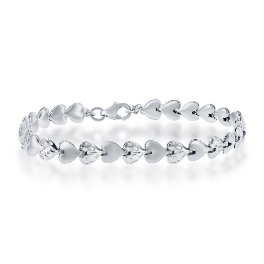 Sterling Silver Alternating Plain and D-C Small Puffed Hearts Bracelet