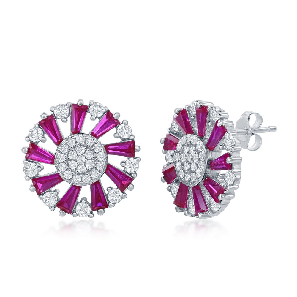 Sterling Silver Baguette CZ Circle Earrings- Ruby