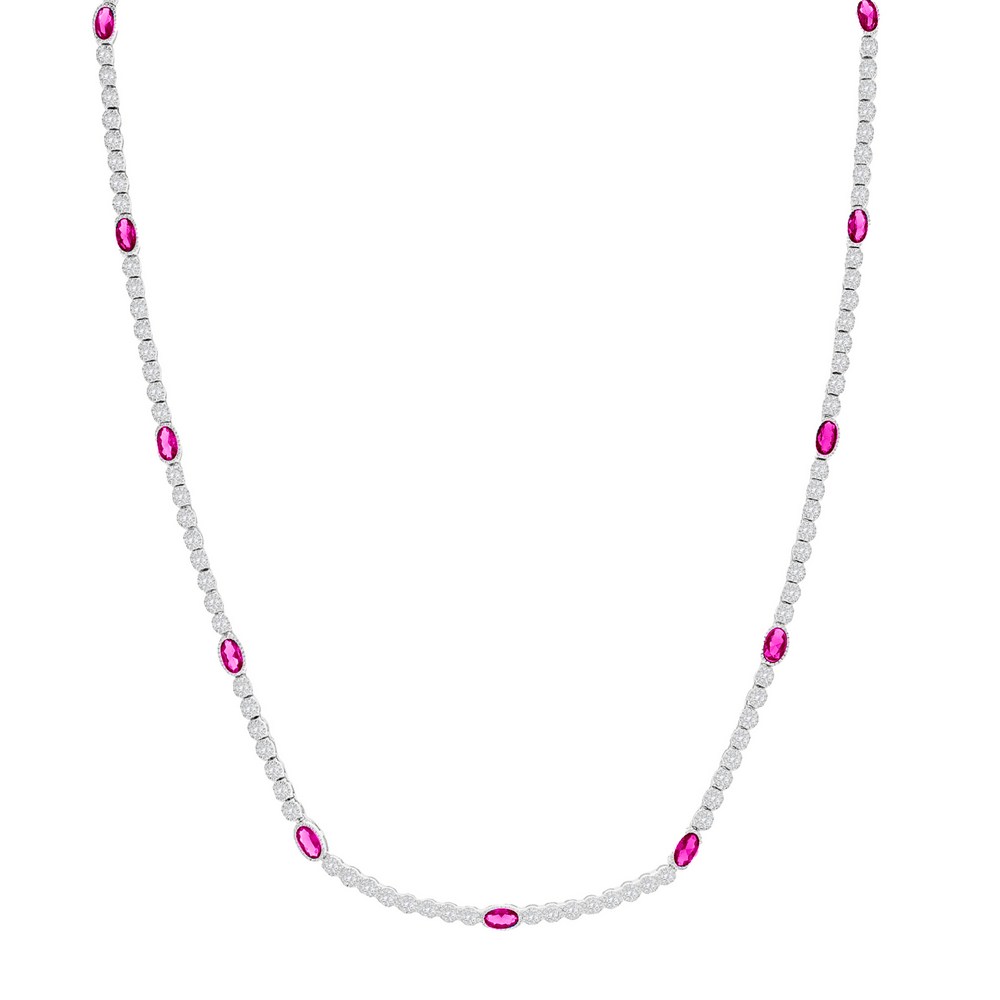 Sterling Silver Beaded Outline Oval & Round CZ Tennis Necklace – Ruby