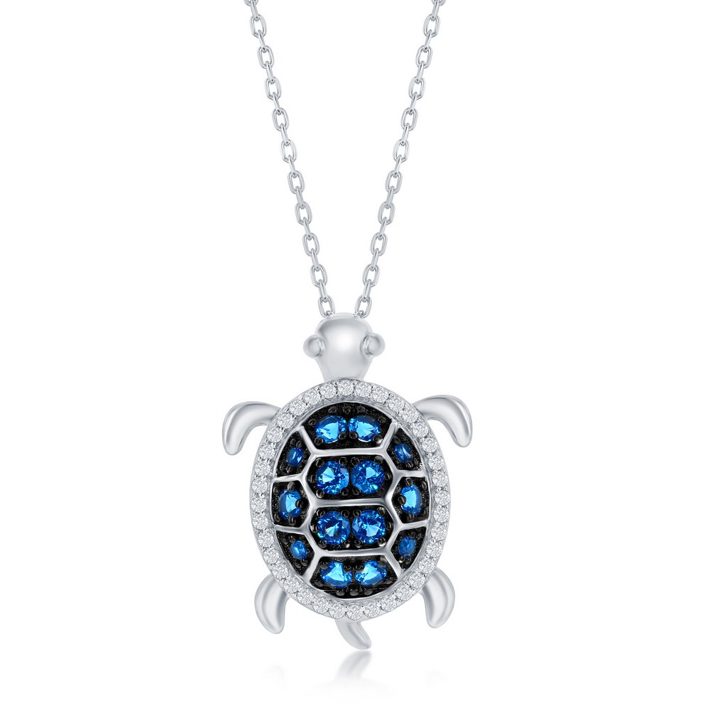 Sterling Silver Blue Spinel and White CZ Turtle Necklace