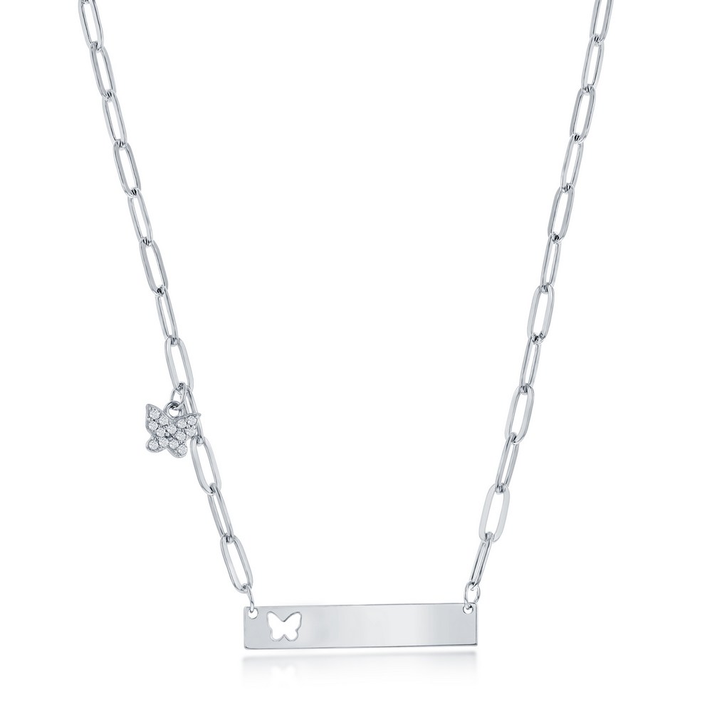 Sterling Silver, CZ Paperclip Bar Neckace – Butterfly Charm