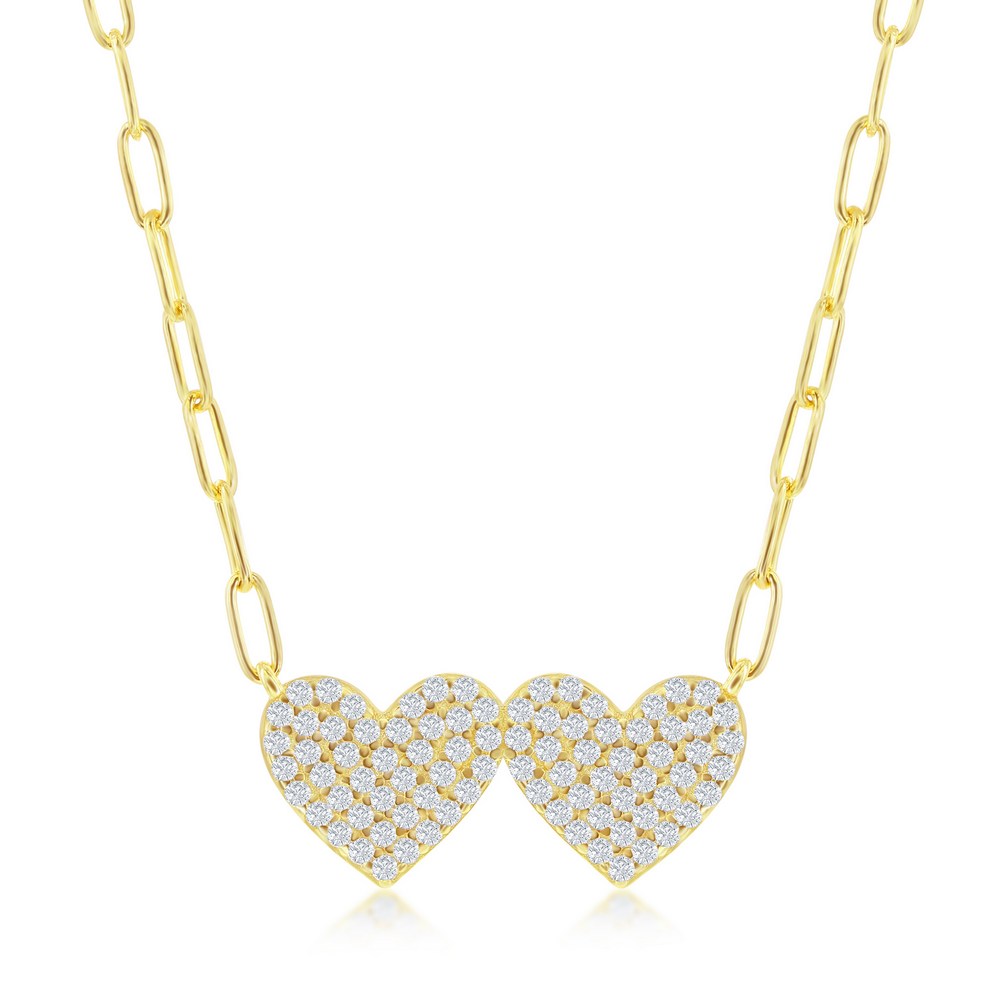 Sterling Silver Double Heart CZ Paperclip Necklace – Gold Plated