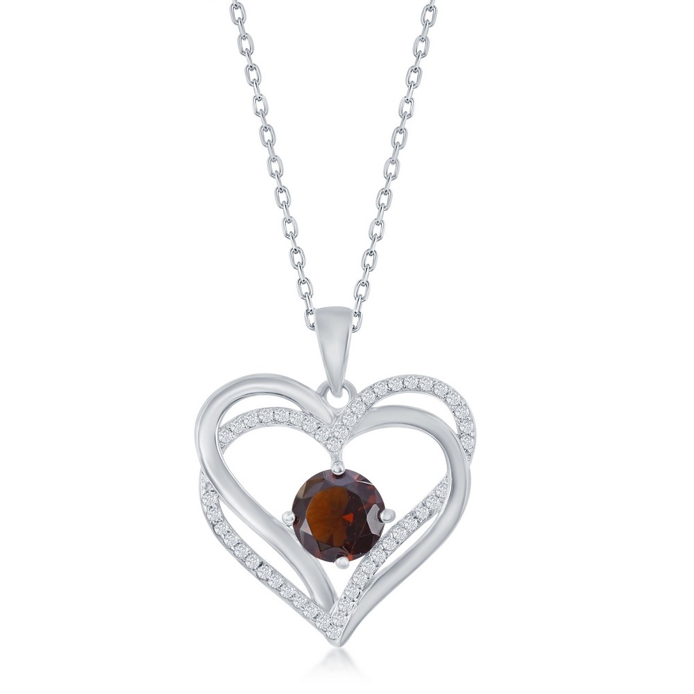 Sterling Silver Double Heart “January” Birthstone CZ Pendant w/Chain – Garnet CZ