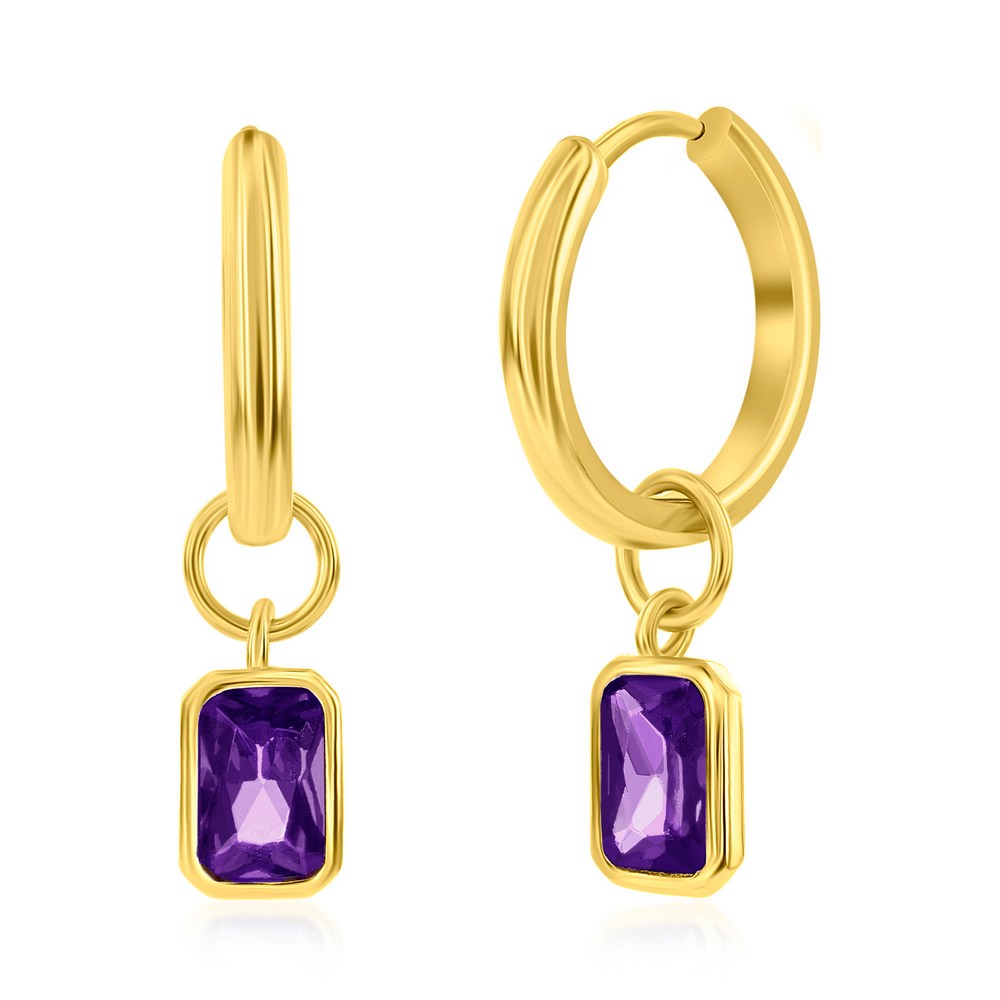 Sterling Silver, ‘February’ Rectangle CZ Charm Hoop, Gold Plated Earrings – Amethyst