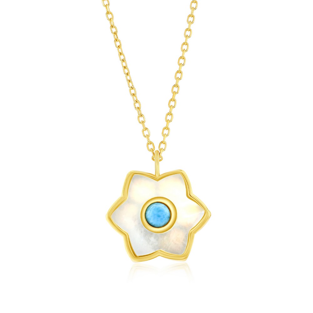 Sterling Silver, Larimar & MOP Flower Necklace – Gold Plated