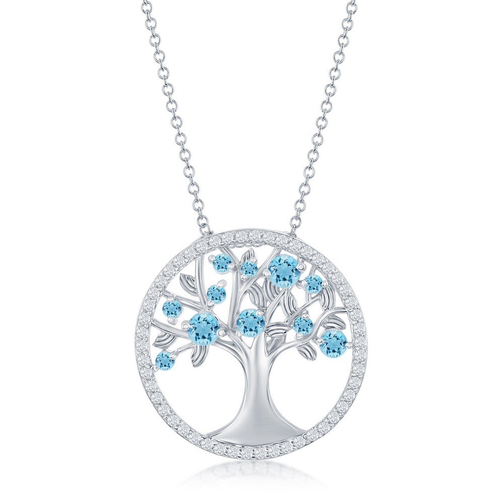 Sterling Silver, ‘March’ Birthstone Tree of Life Necklace – Aqua CZ
