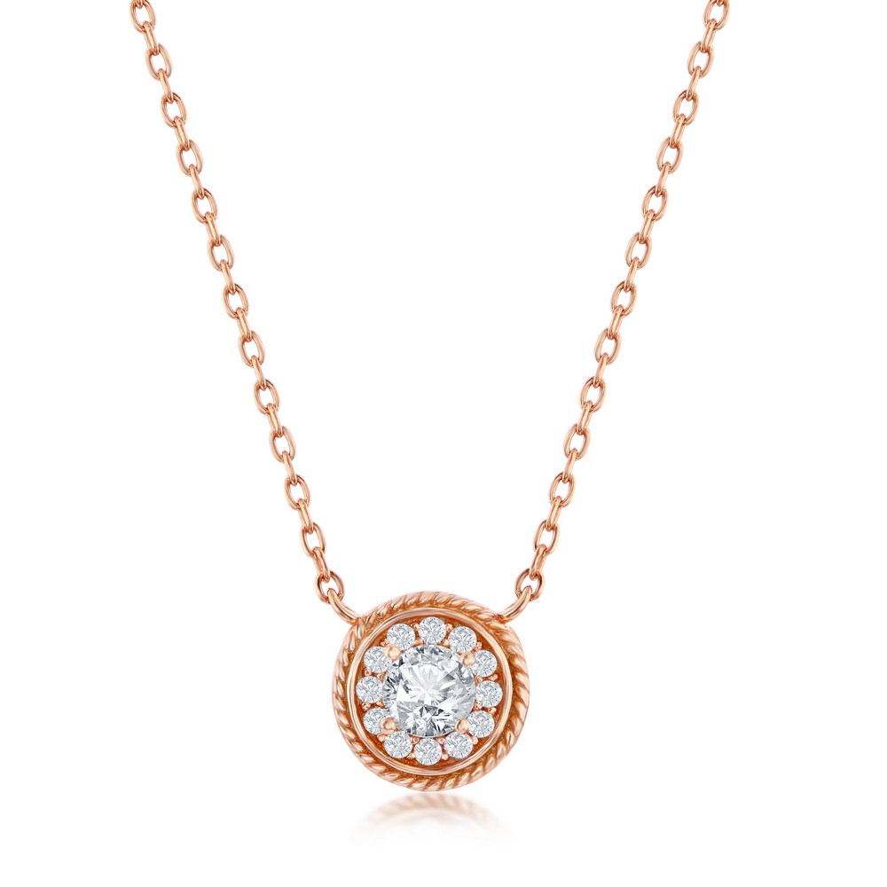 Sterling Silver Round CZ Rope Design Border Necklace – Rose Gold Plated