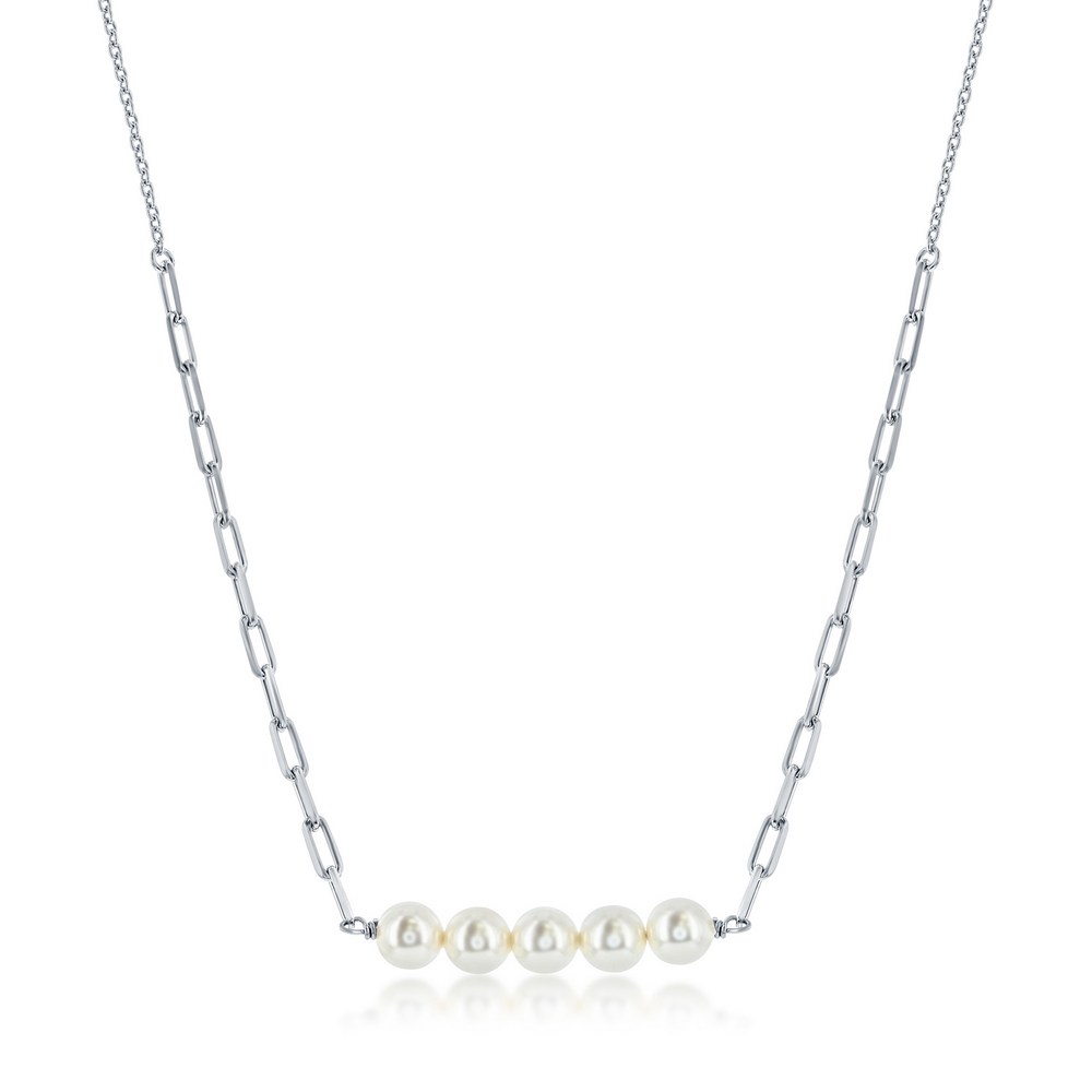 Sterling Silver Round White Simulated Pearl Bar, Paperclip Necklace
