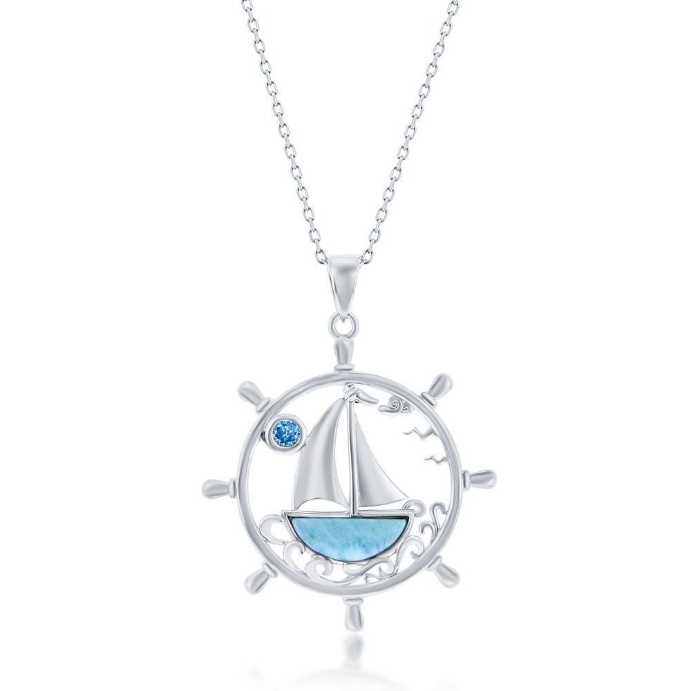 Sterling Silver, Ship Wheel, Larimar Sailboat & Blue CZ Pendant