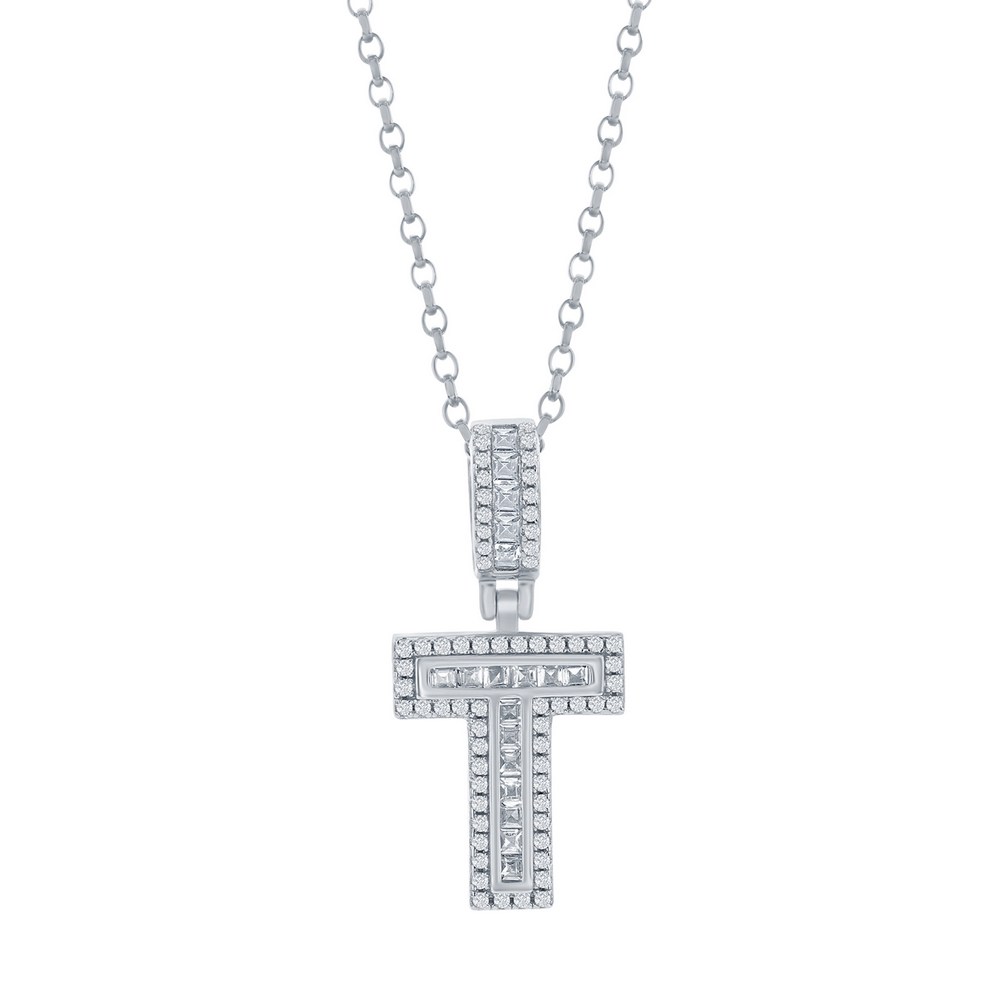 Sterling Silver ‘T’ Baguette CZ Initial Pendant w/Chain