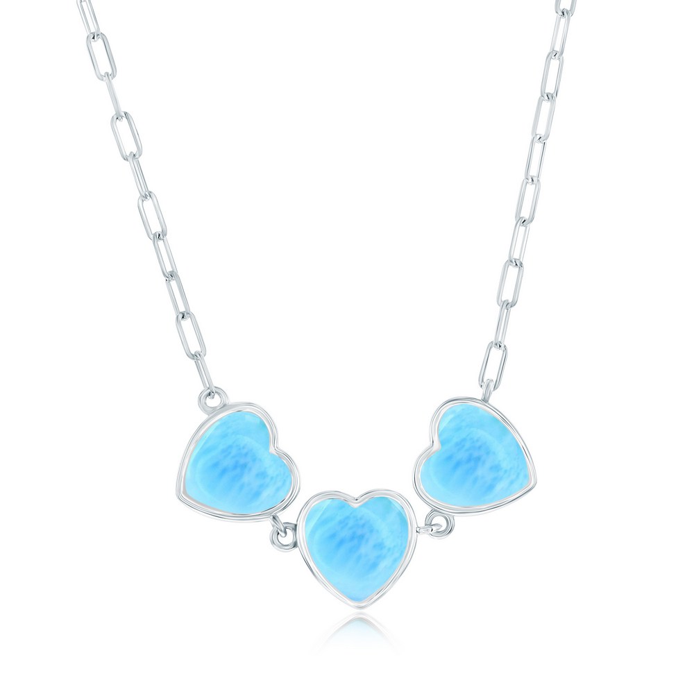 Sterling Silver, Triple Larimar Heart, Paperclip Necklace