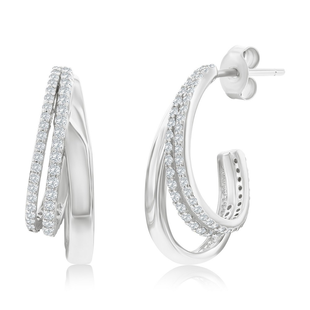 Sterling Silver, Triple Row CZ & Polished Half Hoop Earrings
