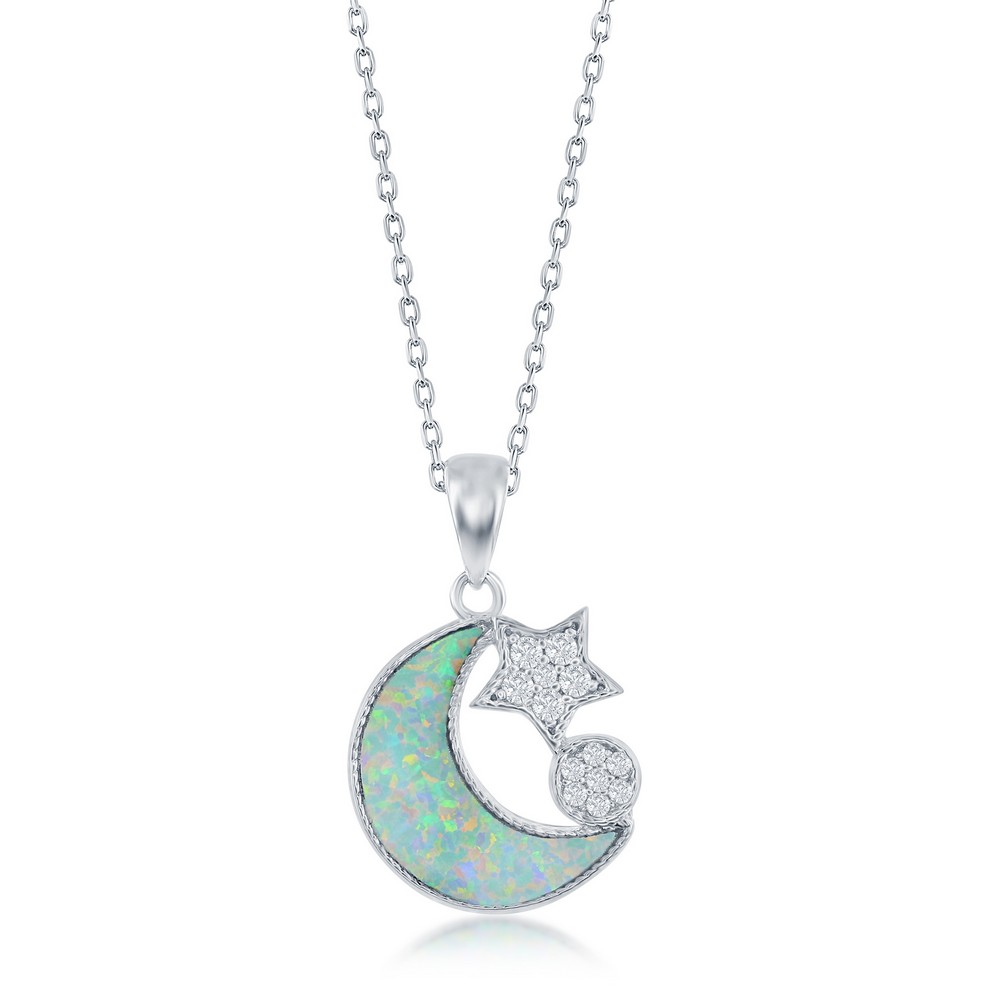 Sterling Silver, White Inlay Opal & CZ Moon and Star Necklace